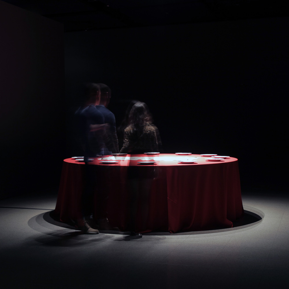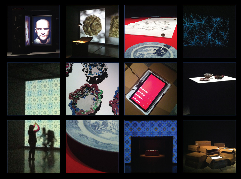The World Is Everything That Is The Case. Curatoriate: Sean Cubitt, Vince Dziekan & Paul Thomas; Exhibition Manager: Chris Malcolm; Participating Artists: Karen Casey, Mark Cypher, Tina Gonsalves, Mark Guglielmetti, Nigel Helyer and Mitchell Whitelaw. Exhibition: John Curtin Gallery, Perth, WA (1 June – 5 August 2012). From Top Left: (1) Tina Gonsalves, Chameleon 2008-10. Emotionally interactive video project exploring emotional contagion. Variable dimensions; (2) Mark Cypher, Propositions 2.0 2011. Suitcase containing sand, Kinect camera, projector, games engine software. Variable dimensions; (3) Nigel Helyer, Weeping Willow 2011. Mixed media and audio. 250cm (w) 130cm (d); (4 & 8) Mitchell Whitelaw, Local Colour 2011. Cardboard, vinyl. Variable dimensions; (5 & 9) Karen Casey, Meditation Wall 2011. Video projection. Variable dimensions; (6) Mitchell Whitelaw, Local Colour 2011. Cardboard, vinyl. Variable dimensions; (7) Mark Guglielmetti, Travelogue: a recording of minute expressions 2011. Digital media installation, electronic components, LCD displays, software, code. Variable dimensions; (10) Nigel Helyer, Weeping Willow 2011. Mixed media and audio. 250cm (w) 130cm (d); (11) Installation view with Karen Casey, Meditation Wall 2011 and Nigel Helyer, Weeping Willow 2011; and (12) Mark Guglielmetti, Travelogue: a recording of minute expressions 2011. Digital media installation, electronic components, LCD displays, software, code. Variable dimensions.